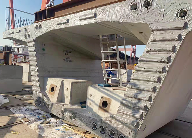 --Segment tryout. Perform segment trial splicing to check and ensure that the pre-stressed pipeline is unobstructed. Lock the assembly angle and move the segment outward a proper distance to facilitate the application of glue. --Segment tryout